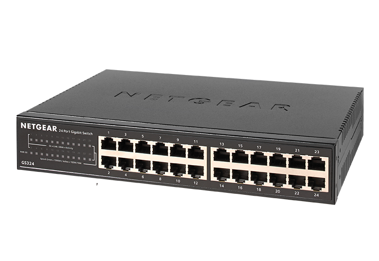 NETGEAR Essentials Switches featuring 24 ports of gigabit Ethernet. This switch is plug-and-play with unmanaged ports needing no additional configuration at full non-blocking performance. GS324v2 GS324-200NAS GS324-200NAS
