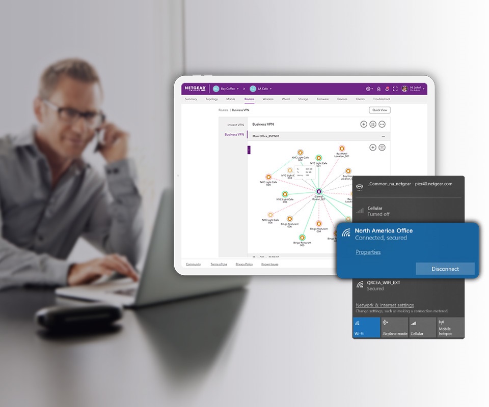 Site-to-site and site-to-multisite VPN to connect the main office with branch and home offices, all through a common SSID with the NETGEAR Insight add-on service, Business VPN*
