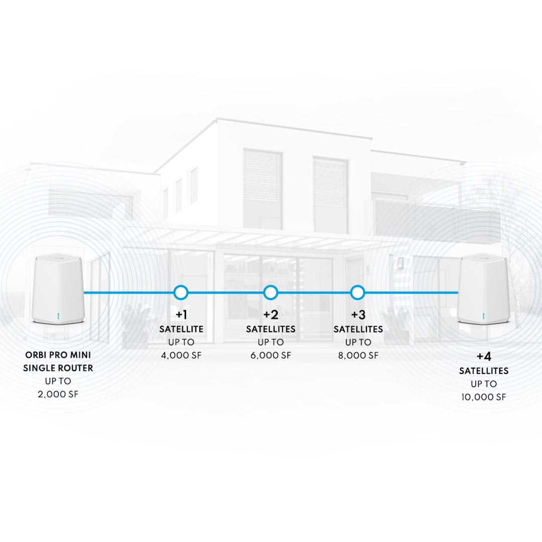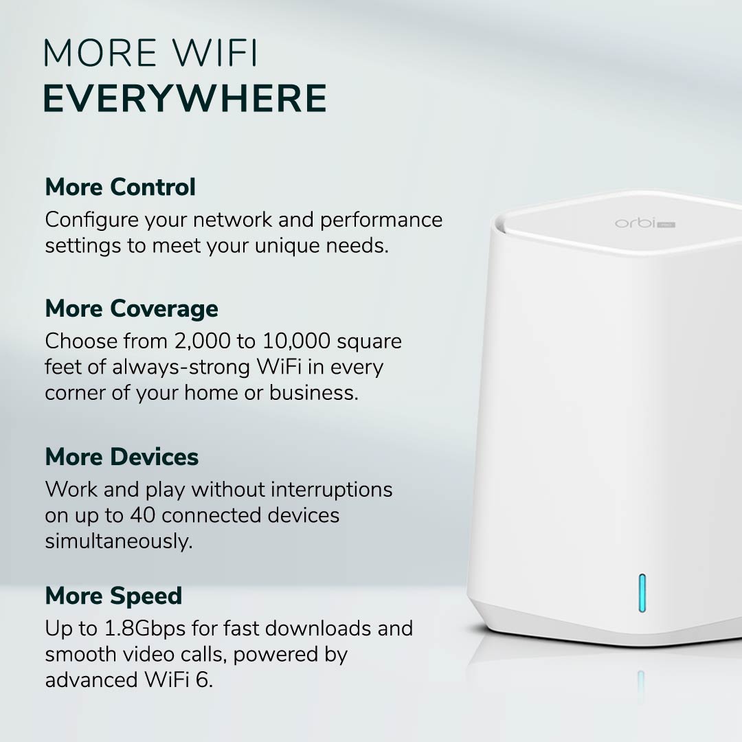 Orbi Pro WiFi 6 Mini AX1800 Mesh System is built to provide your business or your home office with next-level coverage, speed, and connection capacity for the ultimate business-grade WiFi experience, today and tomorrow at an affordable cost for budget conscious businesses.