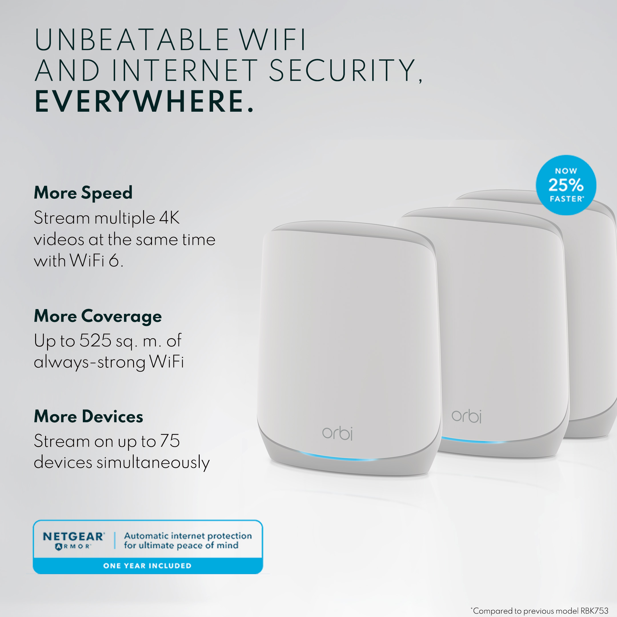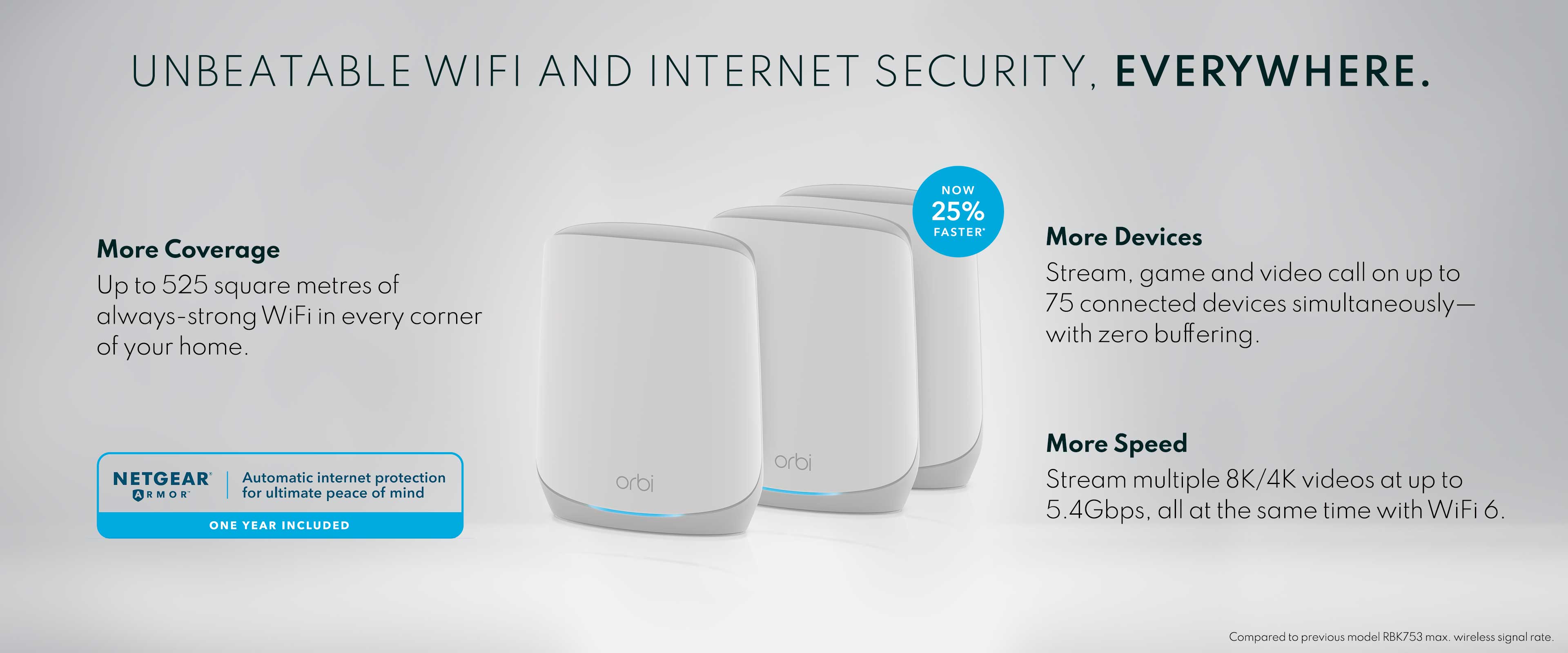 Upgrade to blazing-fast 5.4Gbps† of WiFi 6 on up to 75 devices simultaneously across more space: 7 rooms or up to 525 sq. m. The RBK763S includes a dedicated connection for instant router-satellite communication so WiFi speed stays fast as more devices connected, and 7 Gigabit ports to give your most demanding tech products their own wired connection. Keep your family and your connected devices safe from online threats with 1 year of NETGEAR Armor all-in-one internet security. RBK763S RBK763S-100APS RBK763S-100APS