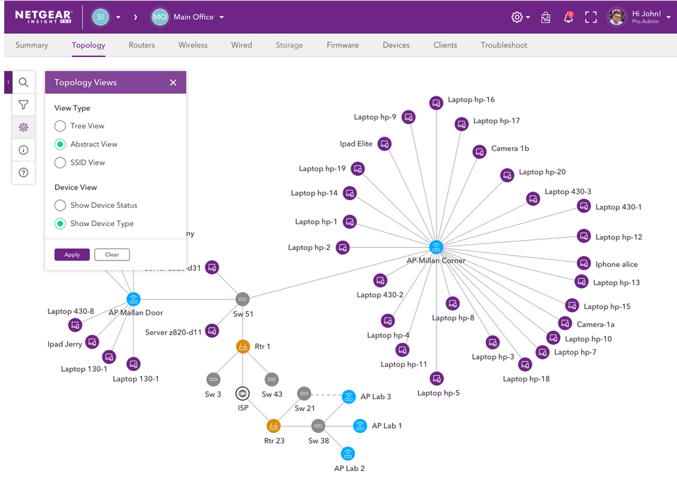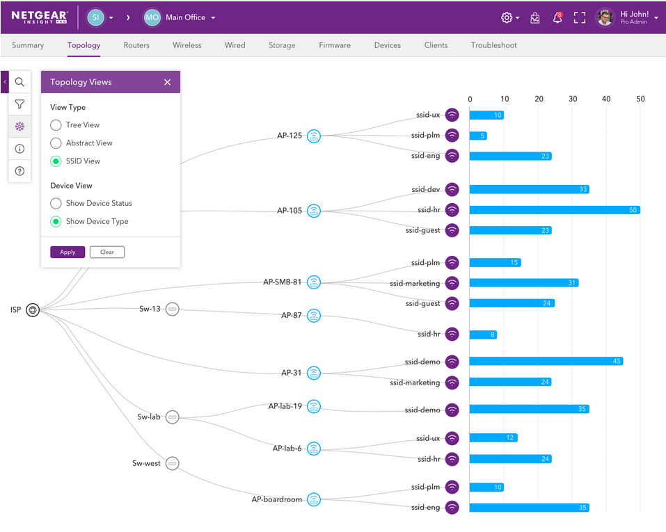 Location-level and per-device downstream topology views offer numerous device details. SSID view provides a quick overview on the device load per access point.