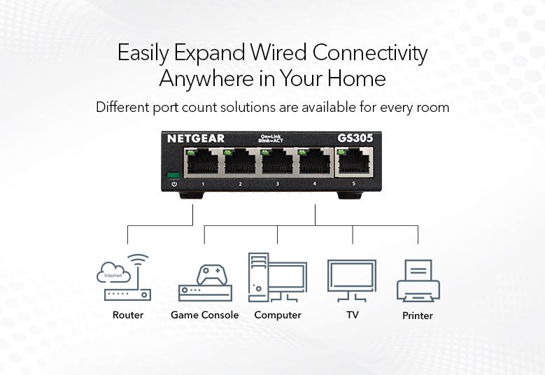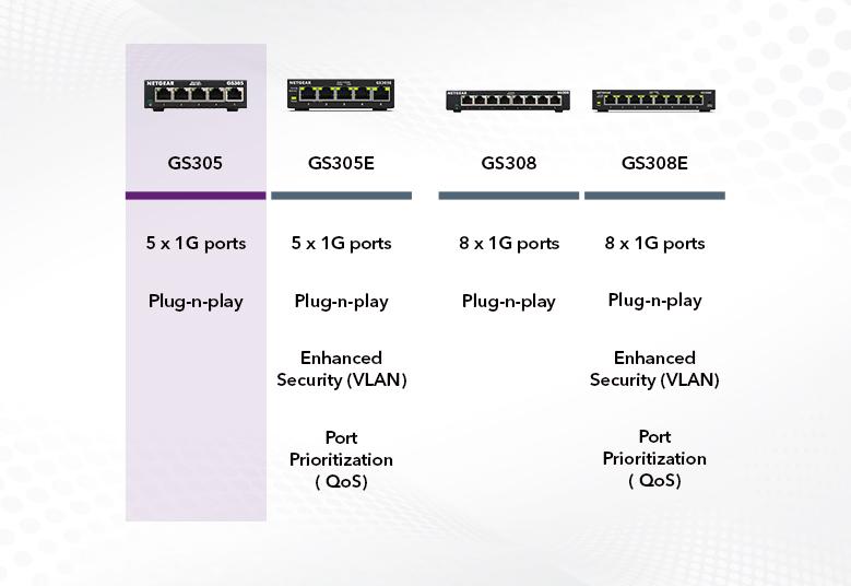 The NETGEAR Gigabit Unmanaged Switch series helps businesses cost-effectively expand their network to Gigabit speeds and higher port counts