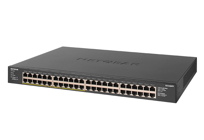 NETGEAR Essentials Switch featuring 48 ports of gigabit Ethernet with 24 PoE+ ports. Unmanaged Essentials Switches are easy, reliable, and affordable network connectivity for home and small offices. Providing power and data from a single Ethernet cable. GS348PP GS348PP-100NAS GS348PP-100NAS
