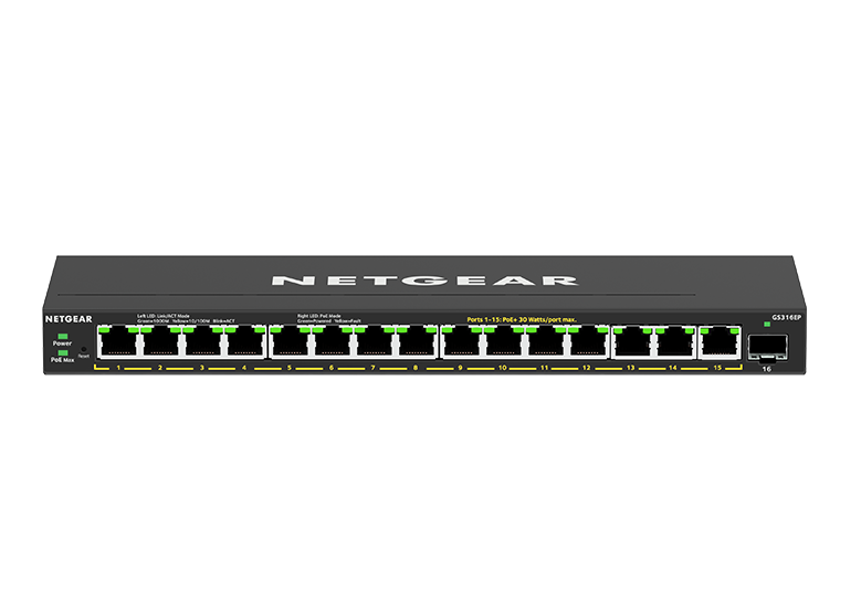 Le Switch Série Plus 16 ports PoE+ Gigabit Ethernet NETGEAR offre des fonctionnalités de mise en réseau professionnelles essentielles et alimente les périphériques PoE+ tels que les téléphones VoIP, les caméras IP, etc.