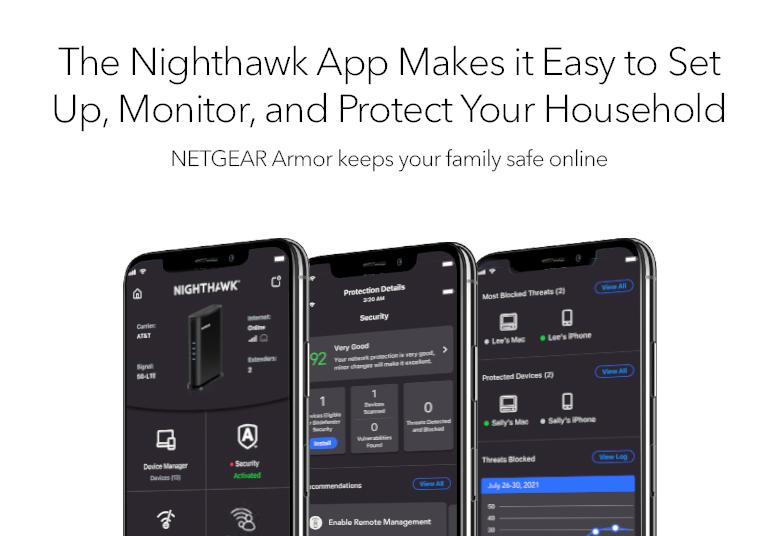 Avec l'application Nighthawk, la configuration ne prend que quelques minutes, pour que vous puissiez profiter plus rapidement d'une meilleure connexion WiFi. Vous pouvez également voir vos appareils connectés, exécuter un test de vitesse Internet, gérer vos abonnements au service NETGEAR et bien plus encore.