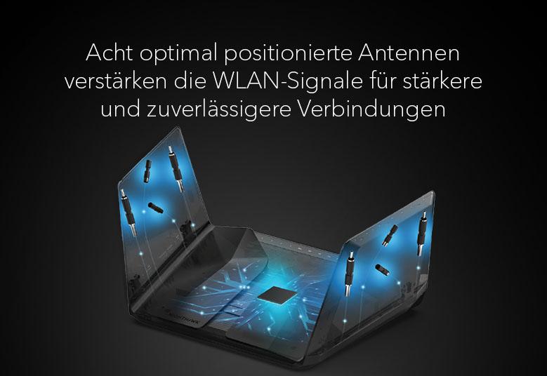 RAXE500 umfasst eine proprietäre WLAN-Optimierung und acht optimal positionierte Antennen, um mehr Kapazität, stärkere und zuverlässigere Verbindungen und weniger Störungen für Ihre Geräte zu liefern