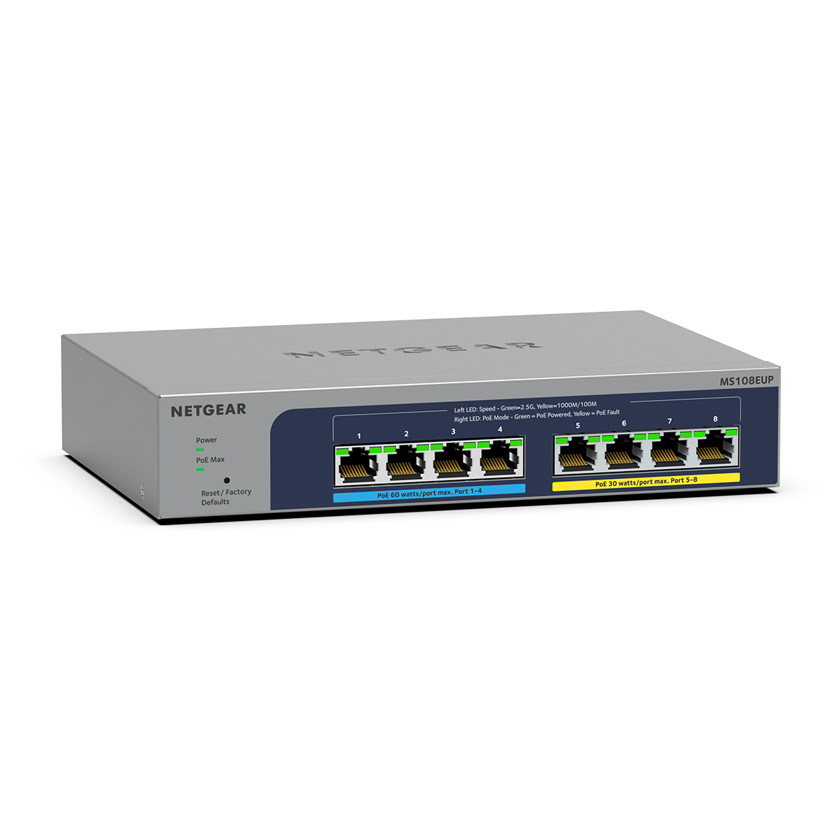 Le switch MS108EUP dispose de 8 ports Multi-Gigabit 1G/2.5G dont 4 ports PoE+ (802.3at, soit max 30W/port) et 4 ports PoE++ Ultra60 (802.3bt, soit max 60W/port). Avec son budget PoE total de 230W, il est parfait pour connecter des points d'accès WiFi 6 nouvelle génération, des caméras de surveillance IP et bien plus encore. Sa conception sans ventilateur le rend extrêmement confortable d'utilisation.