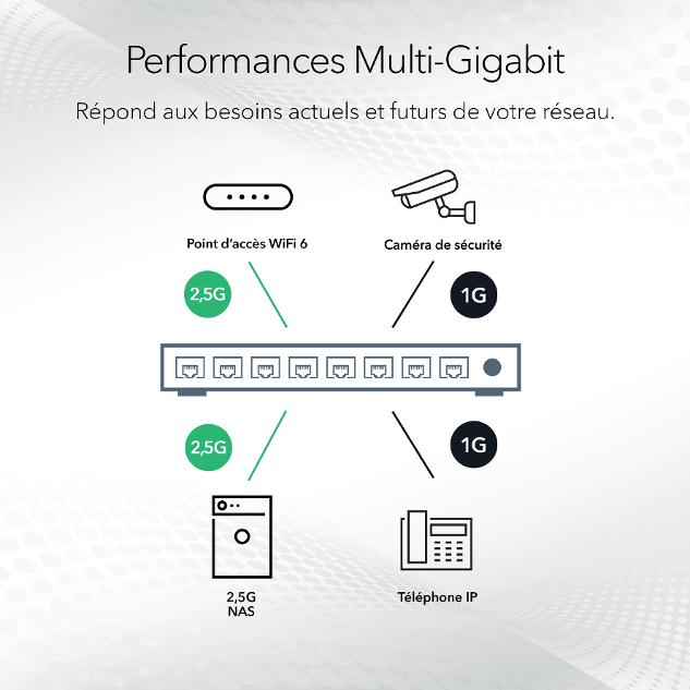 Les 8 ports fournissent des connexions Gigabit et 2.5 Gbit/s avec un fond de panier non bloquant.Prise en charge du PoE