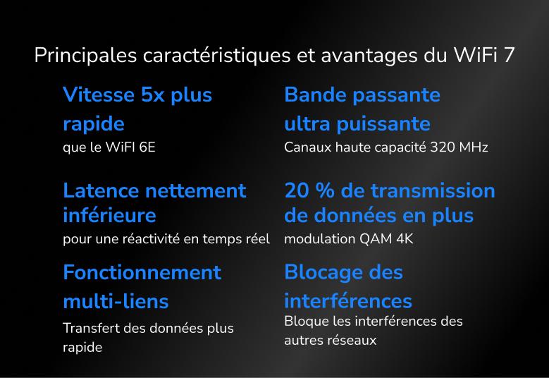 Offre des vitesses WiFi 7 jusqu'à 19 Gbit/s†pour du gaming en temps réel, du streaming 4K/8K, des visioconférences UHD et des expériences immersives AR/VR