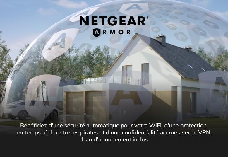Le logiciel NETGEAR ArmorTM fournit une protection automatique pour votre WiFi et vos périphériques connectés (PC, téléphone, appareil photo, TV, etc.) pour une protection en temps réel. 1 an inclus