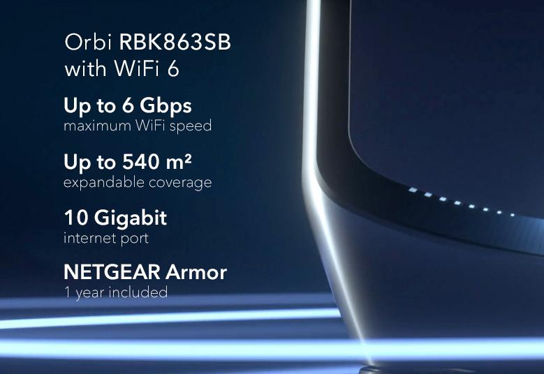 NETGEAR® Orbi™ Tri-band WiFi 6 Mesh System, 10 Gig WAN, 6Gbps, Router + 2 Satellites (RBK863B), with 1-year NETGEAR Armor included | Black Edition