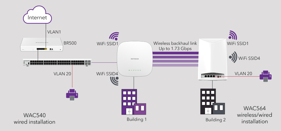 Los modelos WAC540 y WAC564 de NETGEAR incluyen tres potentes radios 802.11ac para establecer una sólida conexión de retorno con un dispositivo de malla instantánea cercano.
