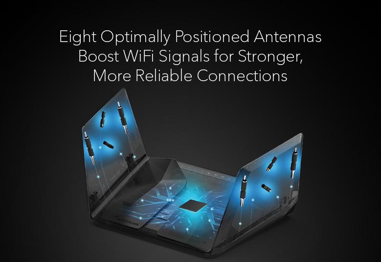 RAXE500 incluye optimización WiFi patentada y ocho antenas en una posición óptima para ofrecer más capacidad, conexiones más fuertes y fiables y menos interferencias en sus dispositivos