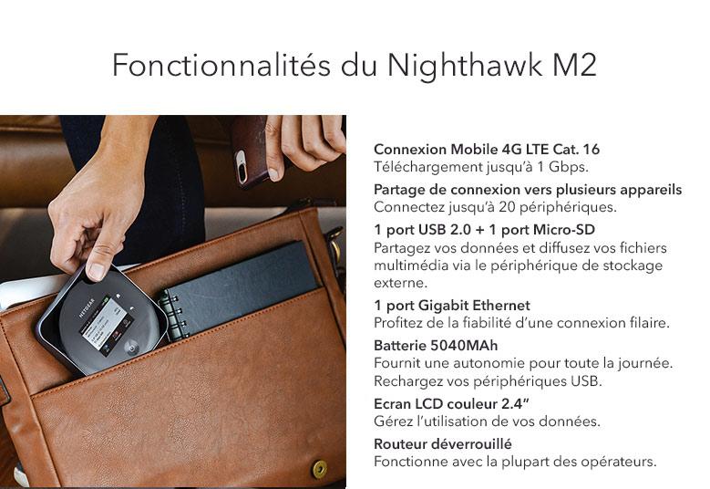 Le routeur mobile Nighthawk M2 de NETGEAR est le routeur mobile Gigabit LTE de nouvelle génération permettant d'atteindre des vitesses de téléchargement maximales de 2 Gbit/s (150Mbit/s en chargement) en fonction de votre opérateur et de la localisation. Votre Wifi mobile atteindra des sommets. Nécessite une (1) carte SIM (non fournie). Ce pack est livré avec une antenne 4G qui vous sera utile pour améliorer les performances de votre signal LTE à la maison ou en déplacement.
