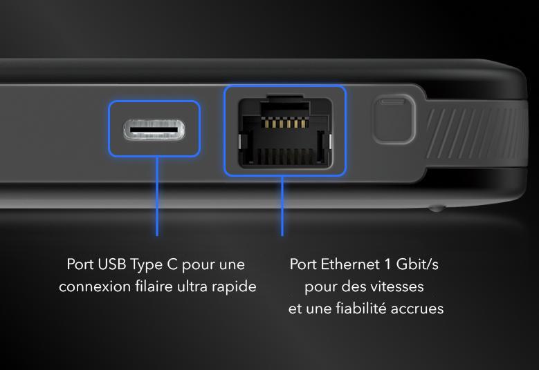 Ports filaires : 1 Gbit/s (Ethernet), 5 Gbit/s (USB)