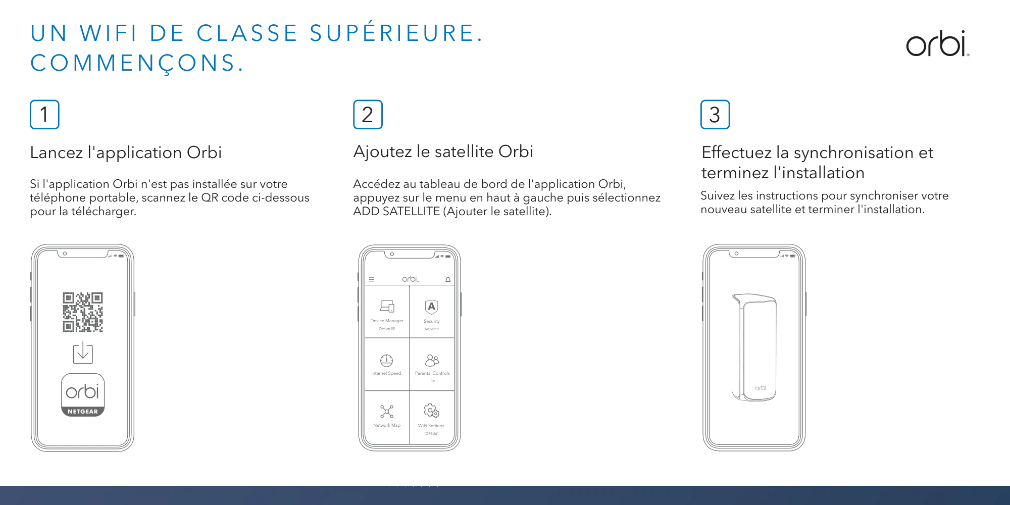 L'application Orbi facilite l'installation de votre Orbi et sa mise en service rapide. Gérez et surveillez facilement votre réseau domestique même lorsque vous n'êtes pas chez vous. Orbi est compatible avec tous les fournisseurs d'accès Internet.
