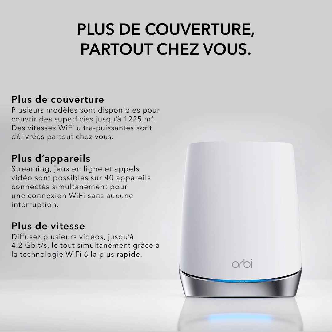 Orbi est conçu pour fournir un WiFi ultra-rapide ransmission de données plus efficace grâce à notre technologie brevetée de Système WiFi Mesh Tri-Band. Résultat : les performance WiFi ne se dégradent jamais et cela partout chez vous, quel que soit le nombre d'appareils connectés.