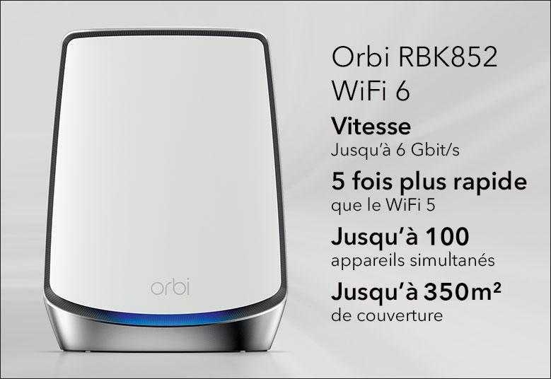 • Performances Wifi : WiFi Tri-bande AX6000 2,4 GHz (2 400 Mbit/s.†) + 5 GHz (2 400 Mbit/s.†) pour connecter les appareils Wifi à Internet Liaison Wifi 5 GHz (1 200 Mbit/s.†) dédiée pour une connexion de données plus rapide entre la base Orbi et le satellite Orbi