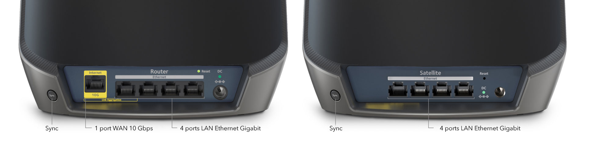 RBK860sb-Tech-Specs_Fullasset NETGEAR Orbi Tri-Band WiFi 6 Router comes with one 10Gbps WAN port. Router and satellite comes with four 1Gbps ethernet ports