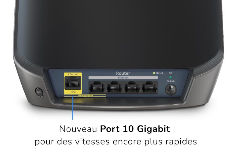 Un (1) port WAN 10Gbps Multi-Gigabit Ethernet, un (1) port LAN 2,5Gbps Multi-Gigabit Ethernet, trois (3) ports LAN 1Gbps Gigabit Ethernet