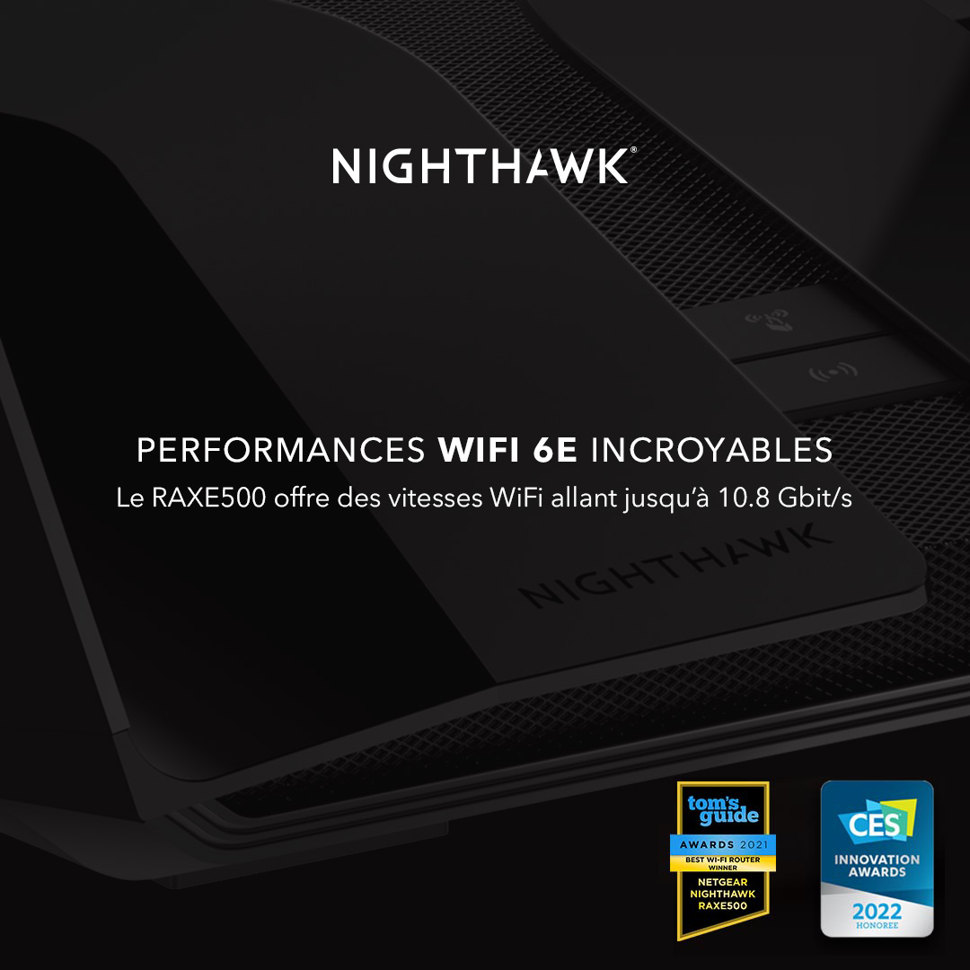Routeur WiFi 6E Tri-band Nighthawk RAXE500, jusqu'à 10,8Gbit/s, 6GHz, NETGEAR Armor™ armor