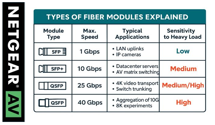 Dans les réseaux AV over IP, les modules SFP+ (10G) et SFP28 (25G) sont particulièrement populaires. Ils offrent une bande passante suffisante pour la vidéo HD et 4K, mais nécessitent certaines précautions :