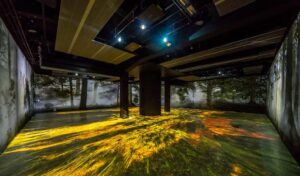 Différentes technologies d’image et de son ont été combinées afin de plonger les visiteurs dans une expérience sensorielle totale, où les contenus visuels et sonores entourent le public de toutes parts.