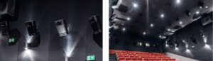 Derrière l’écran, on trouve trois tweeters/médiums JBL 3732-M/HF accompagnés de woofers JBL 3739. Quatre caissons JBL 3183F sont positionnés dans les coins de la salle et sous le plafond. Un subwoofer JBL puissant de 4 kW, basé sur deux haut-parleurs de 18 pouces, gère les basses fréquences.