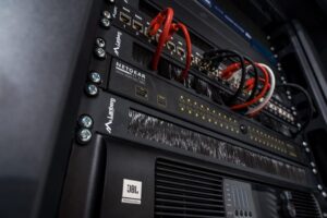 Les signaux audio entre la cabine de projection — en particulier le processeur Dolby Atmos Cinema CP950A — et les amplificateurs (tous regroupés dans un seul rack) sont transmis via le protocole Dante.
