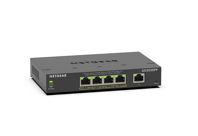 Easy to manage, fundamental network features at an affordable cost for SMBs. GS305EPP offers 120W total power budget to power devices PoE devices such as VoIP phones, IP cameras, wireless access points, etc. GS305EPP GS305EPP-100NAS GS305EPP-100NAS