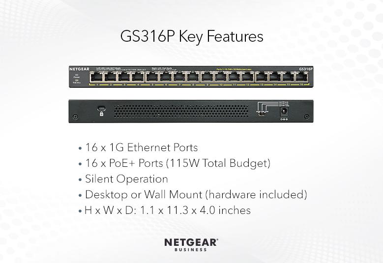 16 PoE+ ports with 380W power budget. Unmanaged Essentials Switches are easy, reliable, and affordable network connectivity for home and small offices. Providing power and data from a single Ethernet cable. GS316P GS316P-100NAS GS316P-100NAS