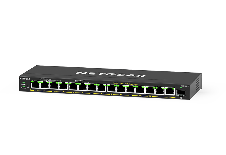 NETGEAR 16 端口千兆位以太网 PoE+ 简单网管交换机提供必不可少的商用网络功能,并为 PoE+ 设备 (如 VoIP 电话, IP 摄像头等) 提供支持。