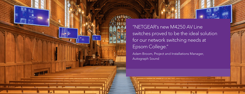 For Epsom College, the M4250s proved to be the perfect choice. “NETGEAR’s new M4250 AV Line switches proved to be the ideal solution for our network switching needs at Epsom College. The assignable ports, controlled via a simple GUI, and the ability to integrate AV over IP protocols in one switch, made things considerably easier for us.” Says Adam Broom.