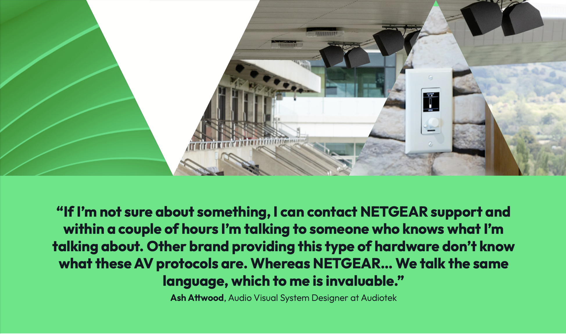 “If I’m not sure about something, I can contact NETGEAR support, and within a couple of hours, I’m talking to someone who knows what I’m talking about. Other brands providing this type of hardware don’t know what these AV protocols are. Whereas NETGEAR… We talk the same language, which to me is invaluable.”