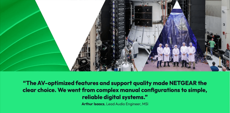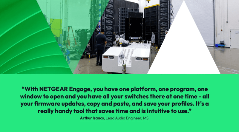 MSI selected NETGEAR M4250 series switches as the backbone of their mobile acoustic testing systems, specifically choosing the platform for its AV-optimized features and robust technical support. The solution centers on NETGEAR’s AV Line switches with pre-configured audio networking profiles that simplified deployment and configuration.