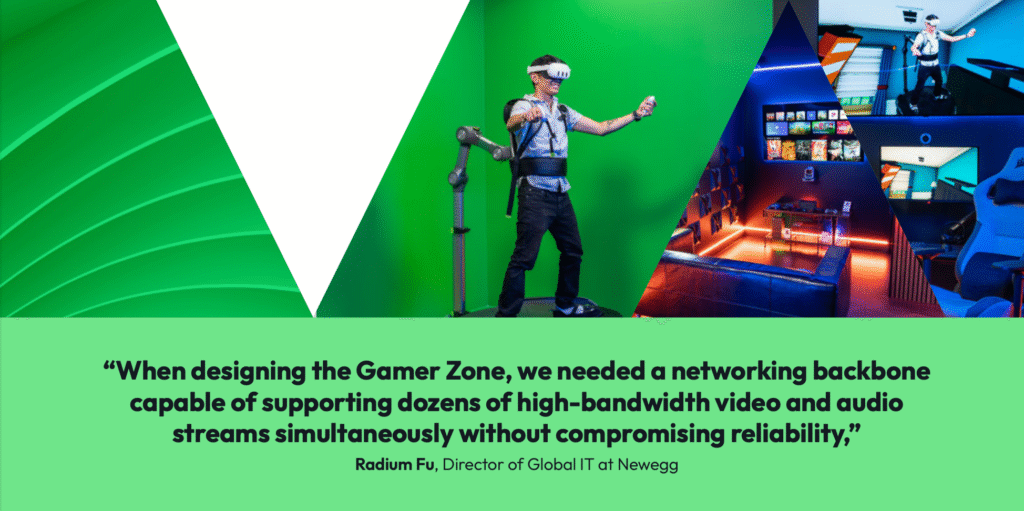 The Newegg Gamer Zone represents a new standard in gaming experiences, serving as both a technology showcase and community hub that brings together gamers, streamers, creators, and innovators. Featuring over $200,000 in cutting-edge hardware, including VR systems, racing simulators, immersive gaming pods, and professional streaming equipment, the venue required a networking infrastructure capable of handling multiple simultaneous 10Gb Ethernet streams, NDI video feeds, and broadcast-quality content production.
