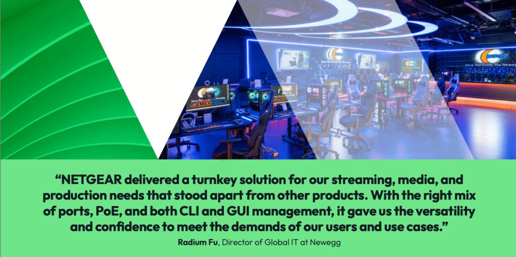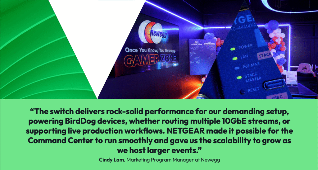 “When designing the Gamer Zone, we needed a networking backbone capable of supporting dozens of high-bandwidth video and audio streams simultaneously without compromising reliability,” said Radium Fu, Director of Global IT at Newegg. “NETGEAR delivered a turnkey solution for our streaming, media, and production needs that stood apart from other products.