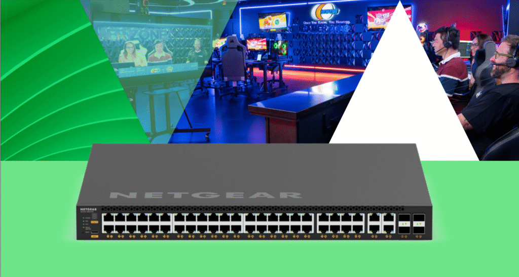NETGEAR SFP+ optical transceiver modules provide high-speed fiber connectivity for critical backbone connections, enabling multiple 10GbE streams throughout the facility while ensuring consistent performance for both competitive gaming and professional streaming applications. The infrastructure seamlessly integrates with the venue’s NDI-enabled environment, allowing for real-time video production and distribution capabilities that meet broadcast industry standards.