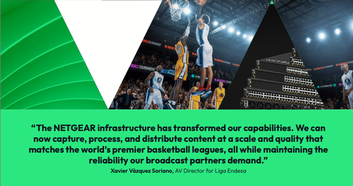 Behind the amazing action of Spain’s premier basketball league lies a sophisticated media infrastructure that captures, manages, and distributes content to millions of fans worldwide. Liga Endesa (ACB) has relied on NETGEAR AV equipment and a Media Asset Management (MAM) system, enabling seamless content production, ultra-low latency video ingestion, and efficient distribution across multiple platforms.