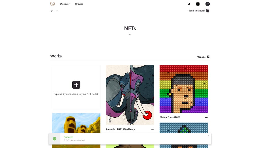 Then, click “Upload” to link your owned NFTs directly from the MetaMask wallet to your Meural account. If you want to Send to your Meural – you can do so directly at this stage, or from your NFT playlist (in Your Library in the app, and Playlists on the web platform).