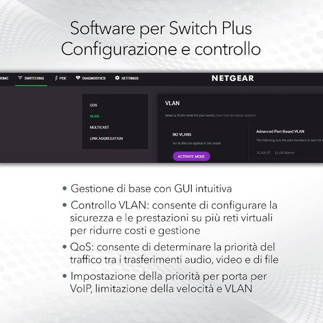 Gestione delle priorità, della pianificazione, del limite di potenza per porta PoE e altro ancora per un controllo semplice su tutti i dispositivi alimentati da PoE.SWITCHING NON-BLOCKING