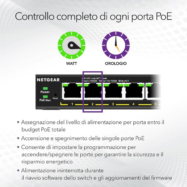 8 porte forniscono fino a 2.5 Gbps di larghezza di banda dedicata e non bloccante ciascuno.Supporto PoE