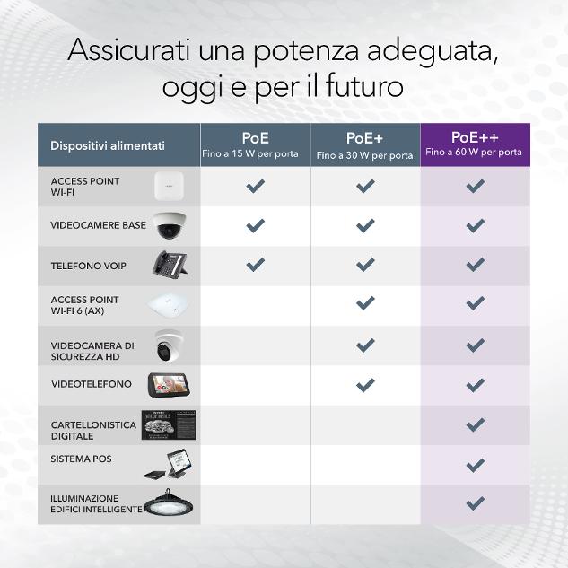 4 porte Ultra60 PoE++ e 4 porte PoE+ forniscono un'alimentazione totale di 230 W per alimentare e collegare i dispositivi con un unico cavo.Controlli PoE avanzati
