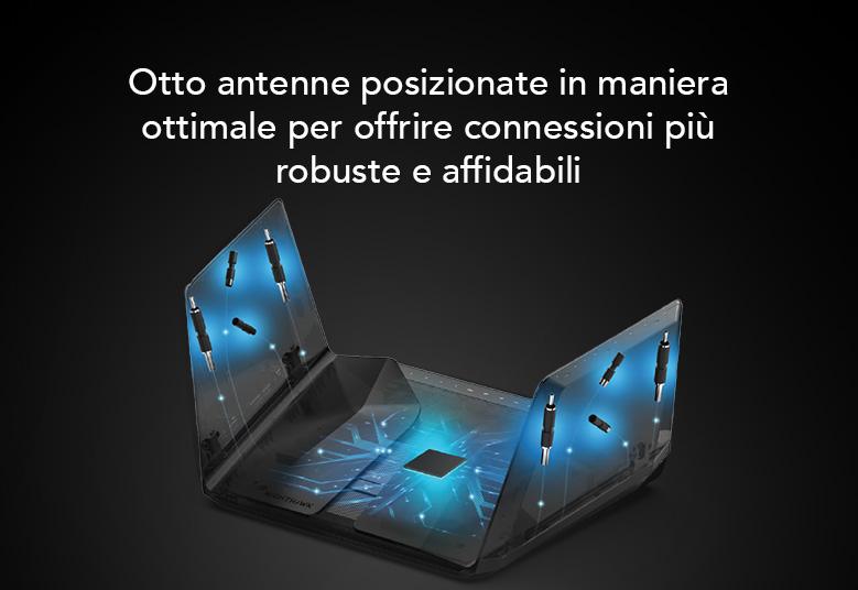 RAXE500 include l'ottimizzazione WiFi proprietaria e otto antenne posizionate in modo ottimale per offrire maggiore capacità, connessioni più robuste e affidabili e meno interferenze ai dispositivi
