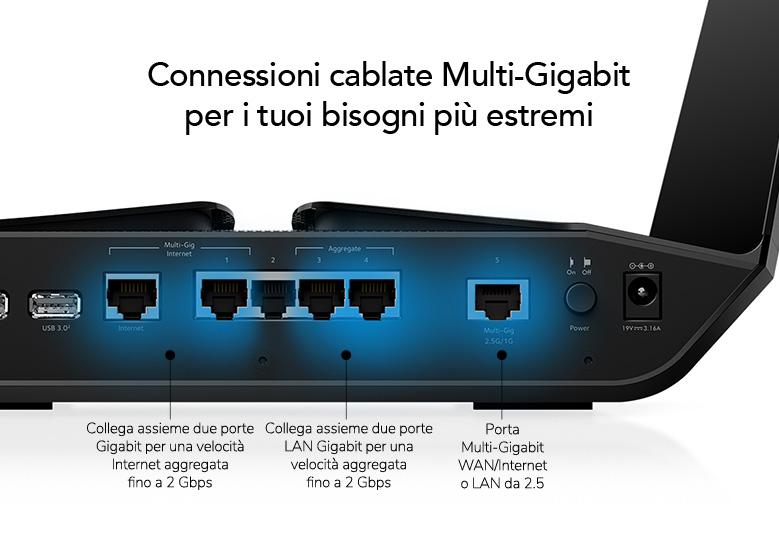 Utilizza la porta Ethernet 2,5G o l'aggregazione di collegamenti 2Gbps per inviare velocità Gigabit+ ai tuoi dispositivi più esigenti e collega ancora più dispositivi cablati alle quattro porte Gigabit Ethernet aggiuntive