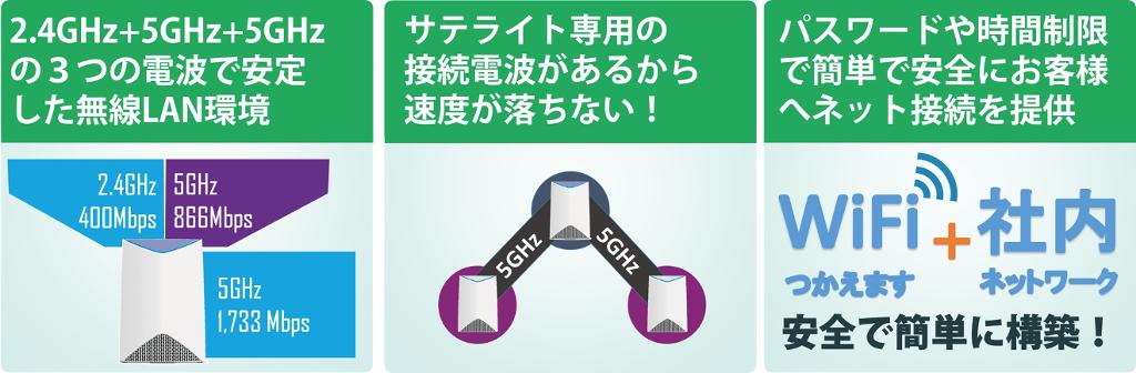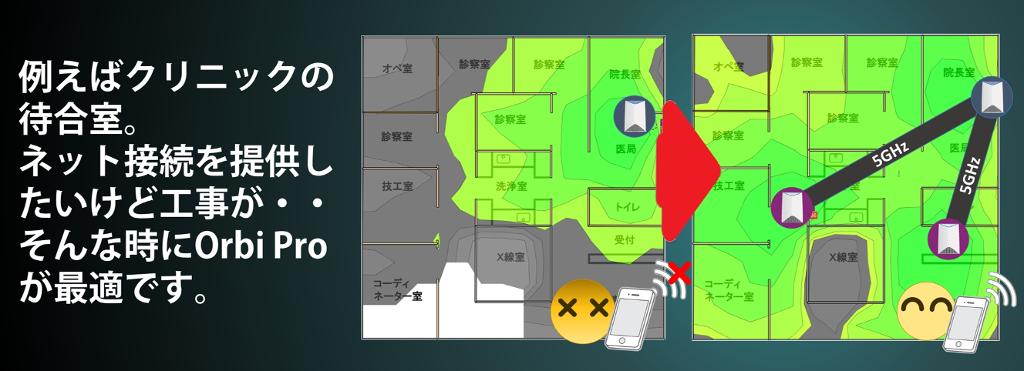 『Orbi Pro』は、 店舗・小規模オフィスなどで無線や有線を使いたいと思ったときに、 簡単にネットワークを構築できるトライバンド ビジネスWIFIシステムです。
