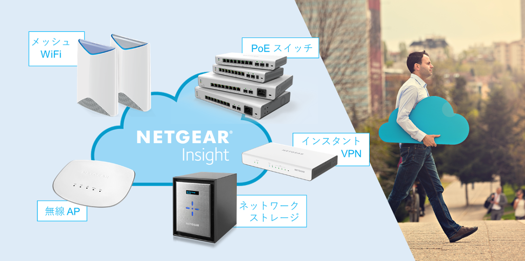 あらゆる中小ビジネスで必要とされるLANスイッチ、VPNルーター、無線LANに加えて、ネットワークストレージ(ファイルサーバー)までスマートフォンアプリ+クラウドで管理できるのはNETGEARのInsightだけです。