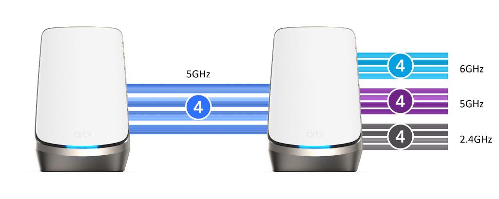 従来のトライバンドの次世代仕様となるクアッドバンドにも対応しており、合計16のWiFiストリームを活用した広範囲での高速通信を実現しました。トライバンドは、2.4GHz帯域、5GHz帯域、追加の5GHz帯域バックホールの3つの独立した無線帯域があります。クアッドバンドは、トライバンドの2.4GHz帯域、5GHz帯域に加え、6GHz帯域があり、そこに追加の5GHz帯域バックホールの4つの独立した無線帯域を持ちます。デバイスは2.4GHz、5GHz、および6GHz帯域に接続し、「Orbi 9」のルーターとサテライトは専用の5GHzバックホールを使用して相互に通信するため、多くの周波数帯を使えることにより広範囲で高速通信が可能となっています。