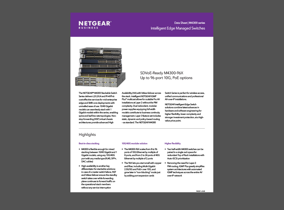 AV over IPスイッチリソースガイド - 110V ダウンロード フライヤー PDF AV over IPスイッチリソースガイド - 220V ダウンロード フライヤー PDF M4350 データシート ダウンロード フライヤー PDF M4350 カタログ ダウンロード フライヤー PDF M4350 画像 表示 製品画像 JPEG/PNG AV技術ガイド GO TIPS URL M4350 製品概要 ダウンロード フライヤー PDF M4350 ビデオ GO ブログ URL PR460/M4350 ライフスタイル画像 表示 製品画像 JPEG/PNG PR460X 紹介ビデオ GO ビデオ URL PR460X 製品画像 表示 製品画像 JPEG/PNG PR460X データシート ダウンロード フライヤー PDF M4250 画像 表示 JPEG/PNG 製品画像 M4300 画像 表示 JPEG/PNG 製品画像 M4500 画像 表示 JPEG/PNG 製品画像 技術的なヒント こちらにアクセス TIPS URL M4300 データシート ダウンロード フライヤー PDF M4300 カタログ ダウンロード フライヤー PDF M4300 DOWNLOAD TIPS PDF M4300スイッチのスタック方法 ダウンロード ホワイトペーパー PDF M4500 データシート ダウンロード フライヤー PDF M4500 カタログ ダウンロード フライヤー PDF ProAV マルチキャストのホワイトペーパー ダウンロード ホワイトペーパー PDF ProAV カタログ ダウンロード フライヤー PDF M4300-96X オンラインコンフィギュレーター こちらにアクセス TIPS URL NETGEAR IGMP Plusとは何ですか? ダウンロード ホワイトペーパー Visio オーディオビジュアル通信を認識するスイッチ ダウンロード フライヤー PDF M4250 データシート ダウンロード フライヤー PDF M4250 カタログ ダウンロード フライヤー PDF ProAVのイノベーション: NDI ダウンロード フライヤー PDF AV over IPネットワーク設計のための10のヒント ダウンロード フライヤー PDF AV over IPスイッチ使用例 ダウンロード フライヤー PDF Pro AVデザインフライヤー ダウンロード フライヤー PDF Pro AVデータシート ダウンロード フライヤー PDF M4250 セールスポイントTOP10 ダウンロード フライヤー PDF M4500が選ばれる理由TOP10 ダウンロード フライヤー PDF M4250シリーズ自動/手動設定 ダウンロード ホワイトペーパー PDF Panasonicカメラのためのスイッチ設定 GO ビデオ URL BirdDogカメラのためのスイッチ設定 GO ビデオ URL PTZOpticsカメラのためのスイッチ設定 GO ビデオ URL Marshallカメラのためのスイッチ設定 GO ビデオ URL InfoComm 2021 GO ビデオ URL AV導入にNETGEARを選ぶ理由 GO ビデオ URL AV over IPネットワーク設計のための10のヒント GO ビデオ URL AV M4250 SCNウェビナー GO ビデオ URL プロAV業界におけるNETGEARの献身とポジティブインパクト GO ビデオ URL プロAV業界に対するNETGEARのコミットメント (Level 3 Audio Visual, Jeff Bethke) GO ビデオ URL NETGEAR製品がProAVに採用される理由 GO ビデオ URL NETGEARのM4300-96Xについて (Principal Senior Consultant at TEECOMM, Lloyd Ranola) GO ビデオ URL 先駆的な製品で成功したNETGEARのプProAVについて (AVI System, Paul Mueller ) Just. Work. GO ビデオ URL NETGEARがプロAV市場に与える影響 (Whitlock's Network Delivery Architect, Kevin Westcott) GO ビデオ URL ZeeVee ネットワークスイッチ 設定ガイド M4250 GO ビデオ URL M4250用 SDVoE設定ガイド GO ビデオ URL M4250用 Qsys設定ガイド GO ビデオ URL M4250用 NDI設定ガイド GO ビデオ URL M4250用 NDI設定ガイド GO ビデオ URL M4250用 Dante設定ガイド GO ビデオ URL M4250用 Aurora設定ガイド GO ビデオ URL M4250用 Crestron NVX設定ガイド GO ビデオ URL M4250用 AMX SVSI設定ガイド GO ビデオ URL NETGEAR 法人向けPro AVケーススタディ: American Dream GO ビデオ URL M4250シリーズの製品概要とデモ GO ビデオ URL NETGEAR AV over IP | M4250シリーズ GO ビデオ URL M4250シリーズのVLAN設定方法 GO ビデオ URL AV over IP向けに設計されたスイッチ: M4250 シリーズ GO ビデオ URL ポットキャスト: Audio Visualが実現するデジタル体験|パート1 GO ビデオ URL ポットキャスト: Audio Visualが実現するデジタル体験|パート2 GO ビデオ URL 技術的なヒント: M4250 ユーザーインターフェイス操作方法 GO TIPS,ビデオ URL M4250 AVラインスイッチシリーズの紹介 GO ビデオ URL M4300シリーズのポートを無効する方法 GO ビデオ URL 60秒でVLANを設定する方法 GO ビデオ URL 技術的なヒント: Web管理者ページからM4300スイッチにログインする方法 GO ビデオ URL 技術的なヒント: コマンドラインからM4300スイッチにログインする方法 GO ビデオ URL Pro AVスイッチのAuto-Trunkモードの設定方法 GO KB記事 URL Pro AVスイッチのAuto-LAGモードの設定方法 GO KB記事 URL VLANの設定について GO KB記事 URL VLANとは何ですか? GO KB記事 URL M4300-96X スイッチの電源ユニット (PSU) の導入および交換方法 GO KB記事 URL M4300スタック構成時にネットワーク上のデバイスに到達できない理由 GO KB記事 URL M4300-96Xのスロットベースのポート番号と設定 GO KB記事 URL Danteオーディオ用 M4300設定ガイド GO KB記事 URL M4300シリーズでは、SDVoEのためにスタッキングやリンクアグリゲーション (LACP) を使用すべきですか? GO KB記事 URL M4300-96Xでのホットスワップ方法 GO KB記事 URL M4300シリーズの半二重モードに関する制限事項 GO KB記事 URL M4300シリーズのスタッキング情報 GO KB記事 URL MILAN/Avnu Allianceのコンプライアンスと認証について GO コミュニティ投稿 URL M4300-24X2