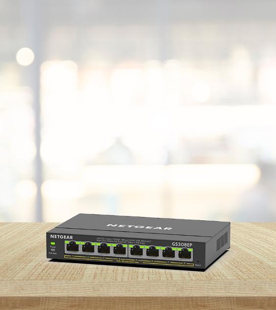 NETGEARのギガビット8ポート PoE+対応 アンマネージプラススイッチは、基本的なビジネスネットワーキング機能を提供し、VoIP電話やIPカメラなどのPoE+デバイスに電力を供給します。